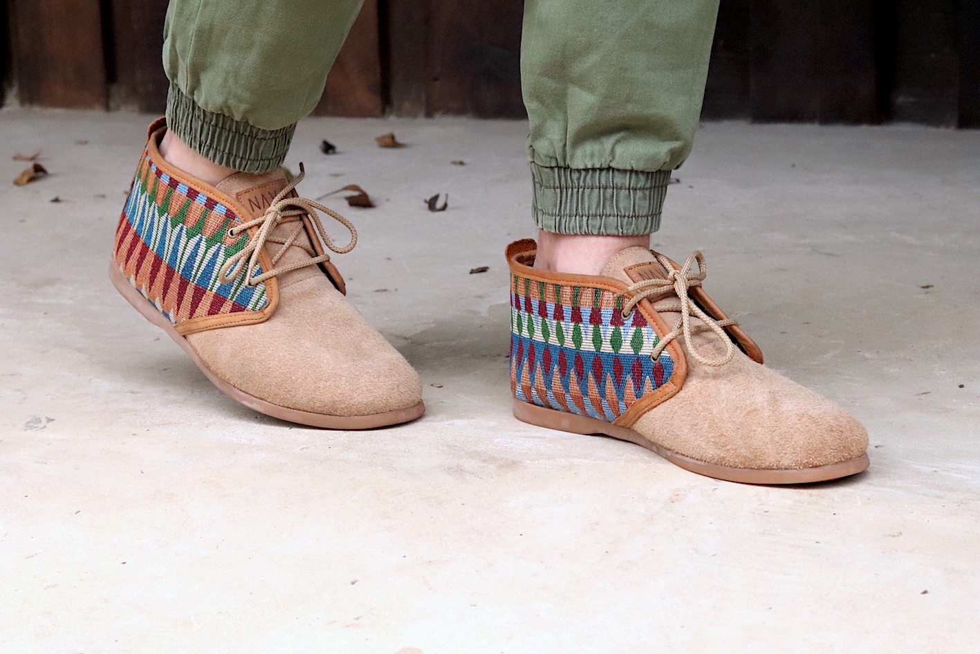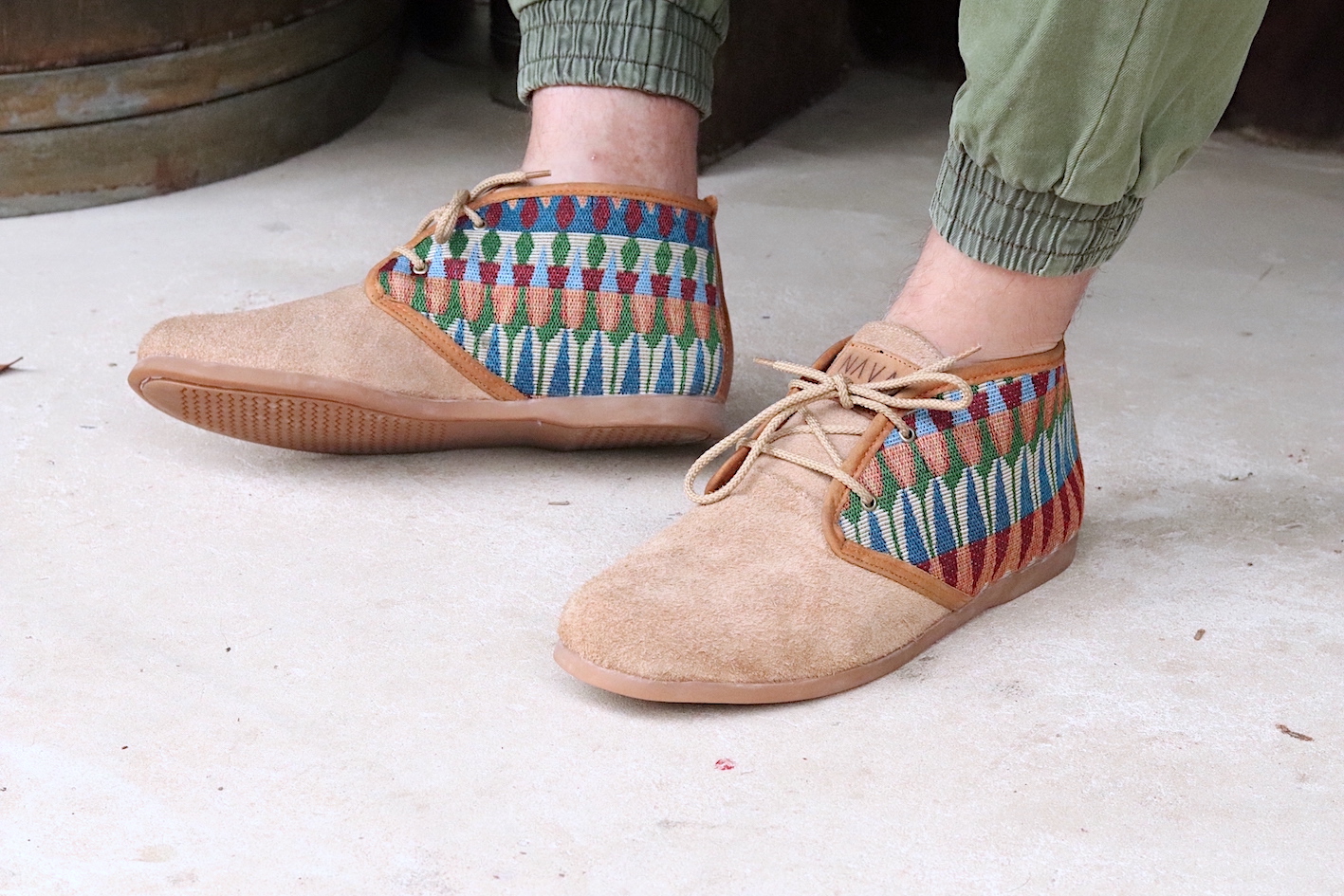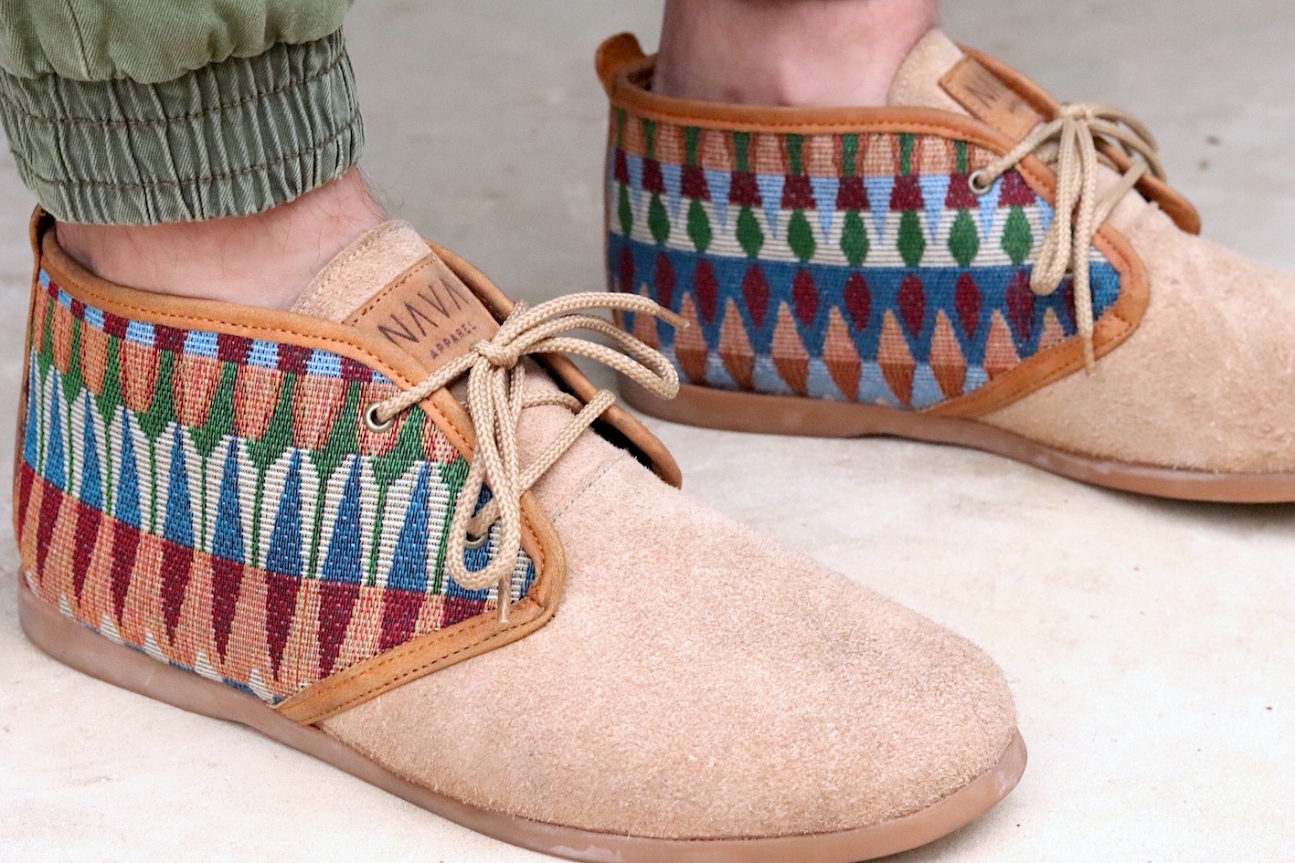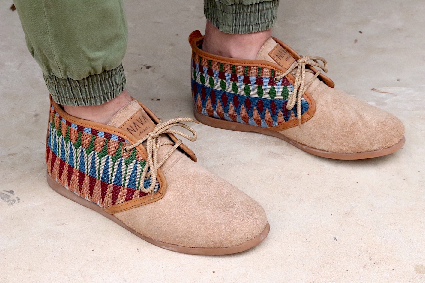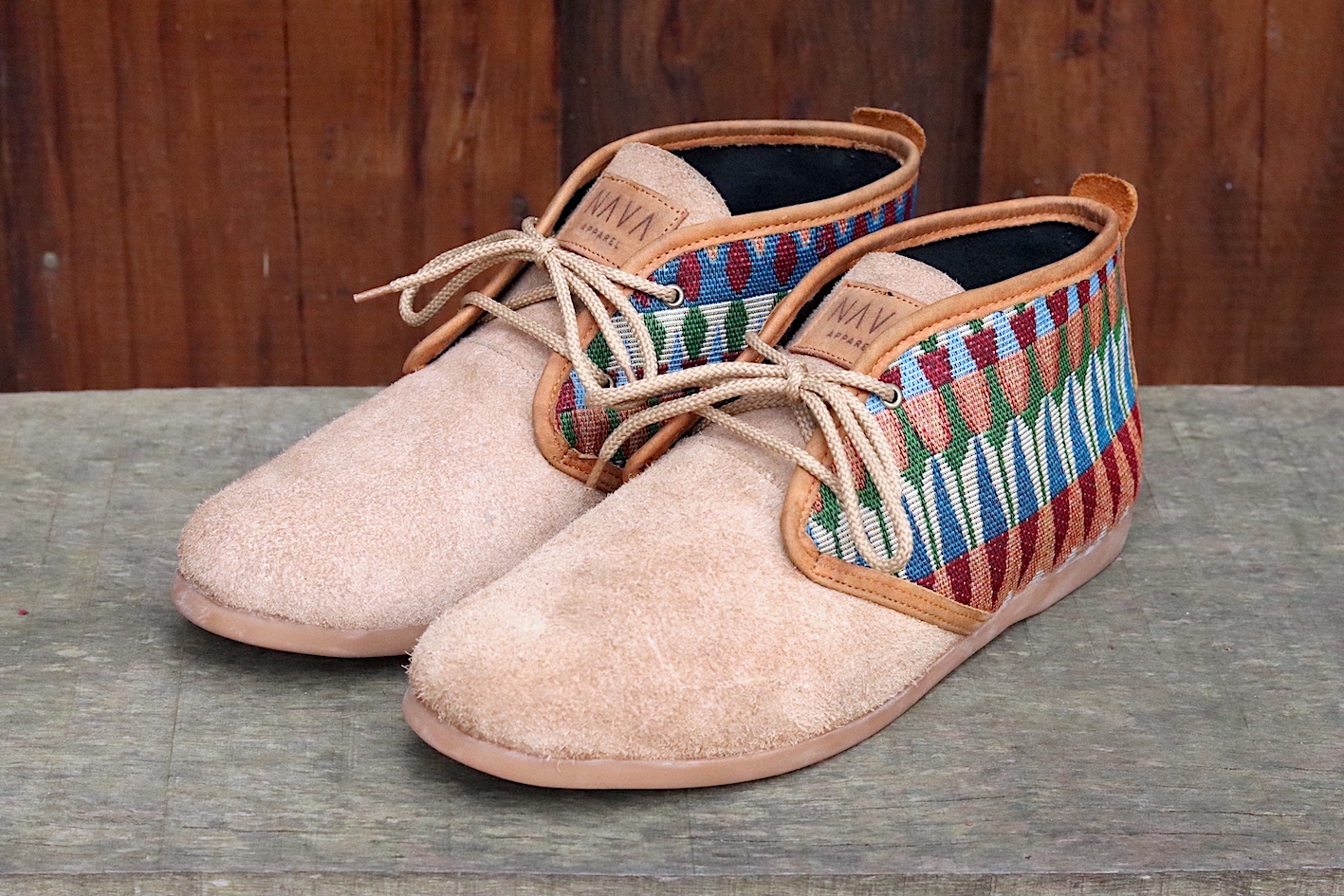 Our Men's NAVA Vellies - Tsonga a modernised version of the original South African Veldskoen. Manufactured in sand suede with a tribal pattern design and tan leather trim. Interior of our Men's NAVA Vellies - Tsonga fully lined with leather and fitted with fiber board insoles. Covered in latex foam and wrapped with leather for your comfort. As a matter of fact our fiber board innersoles are much more breathable and durable. Also lasting up to 10 years, as well as helping to prevent soles from splitting in half. Fitted with 100% genuine eco rubber soles for outstanding quality and good grip. Soles also hand-stitched into the bottom of the shoe. All soles can be replaced and recycled when needed. All NAVA Apparel shoes handmade by local South African craftsmen and women. Without their skills, our quality products wouldn't exist.