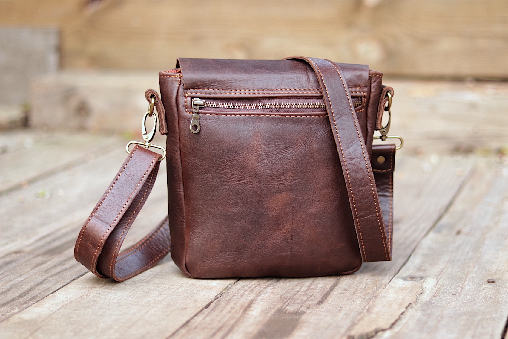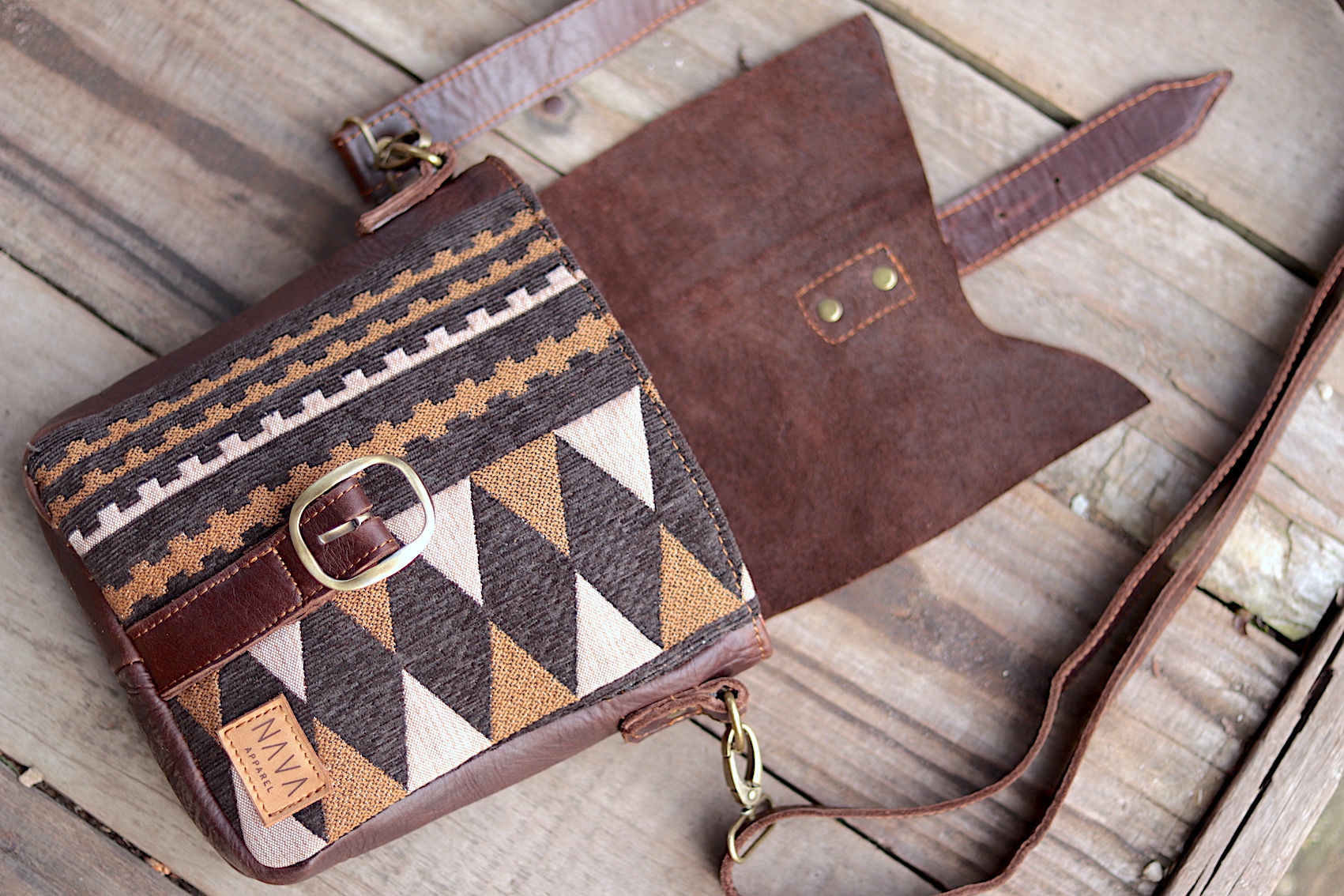 The interior of this Postman Bag - Zulu also lined with an original South African Shweshwe fabric for strength and style. Sporting a live edge fold over flap, antique brass fittings and adjustable shoulder strap. As well as a zipped pocket on the back. Hence the Postman Bag is great for travelling, being the perfect size for all essential items. All NAVA Apparel bags are handmade by local South African craftswomen.